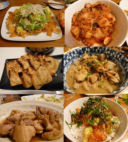 まずはサラダです!!ホタテとレタスとサラダ、カリカリとしているスナックみたいなもの(スイマセンnabenjyamin名前がわかりません・・)がとてもマッチしていてめちゃくちゃおいしい!そして、タコキムチ!春雨とタコそしてチムチの味がグー!!かつイカも入っていましたか?次に巾着中に入っているキムチ納豆。まるこが、ものすごく気に入っていました。そしてモツ煮込み。nabenjyaminはモツが大好きなんです。お味噌仕立てですかね?懐かしい味がして3杯おかわりしてすいません・・・(汗)そしてシメがびっくりの、マグロとアボガド和え御飯!nabenjyaminこれまた、アボガド大好きなんですよね♪かつマグロとあえるなんて本当に上品に頂いてしまいました♪♪そしてこれまた、チキンが御飯にあうこと!!
